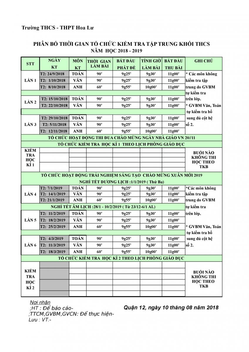 LỊCH KIỂM TRA ĐỊNH KÌ KHỐI THPT NĂM HỌC 2018 - 2019